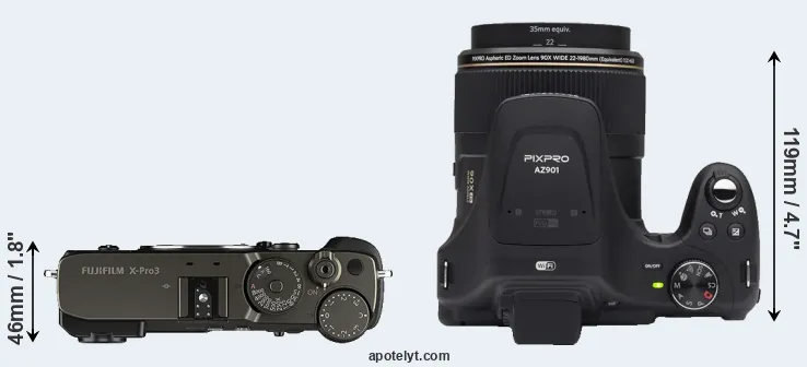 The side-by-side display below illustrates the physical size and weight of the Fujifilm X-Pro3 and the Kodak AZ901. The two cameras are presented according to their relative size. Three consecutive views from the front, the top, and the rear side are shown. All width, height and depth dimensions are rounded to the nearest millimeter.