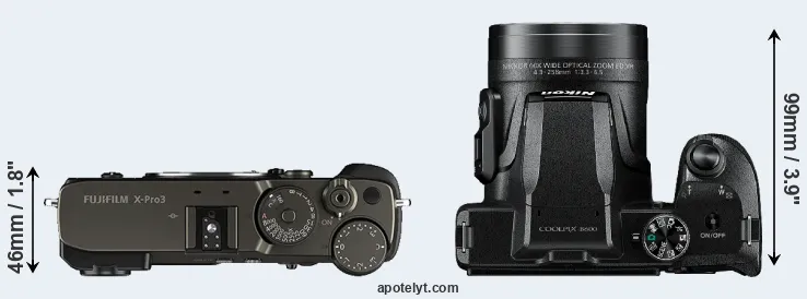 The physical size and weight of the Fujifilm X-Pro3 and the Nikon B600 are illustrated in the side-by-side display below. The two cameras are presented according to their relative size. Three consecutive perspectives from the front, the top, and the back are available. All width, height and depth dimensions are rounded to the nearest millimeter.