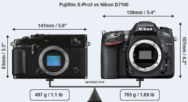 An illustration of the physical size and weight of the Fujifilm X-Pro3 and the Nikon D7100 is provided in the side-by-side display below. The two cameras are presented according to their relative size. Three successive views from the front, the top, and the rear are shown. All width, height and depth measures are rounded to the nearest millimeter.