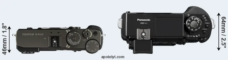 The side-by-side display below illustrates the physical size and weight of the Fujifilm X-Pro3 and the Panasonic L1. The two cameras are presented according to their relative size. Three successive views from the front, the top, and the rear are shown. All width, height and depth measures are rounded to the nearest millimeter.