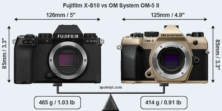 The Fujifilm X-S10 and the OM System OM-5 II are two digital cameras that were revealed to the public, respectively, in October 2020 and June 2025. Both the X-S10 and the OM-5 II are mirrorless interchangeable lens cameras that are based on an APS-C (X-S10) and a Four Thirds (OM-5 II) sensor. The Fujifilm has a resolution of 26 megapixels, whereas the OM System provides 20.2 MP.