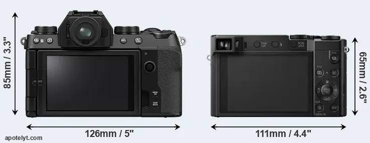 If the front view area (width x height) of the cameras is taken as an aggregate measure of their size, the Panasonic TZ100 is considerably smaller (33 percent) than the Fujifilm X-S10. In this context, it is worth noting that neither the X-S10 nor the TZ100 are weather-sealed.
