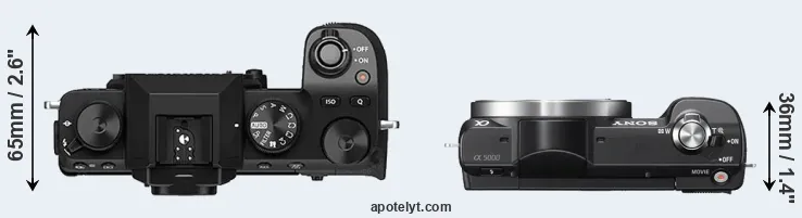 The side-by-side display below illustrates the physical size and weight of the Fujifilm X-S10 and the Sony A5000. The two cameras are presented according to their relative size. Three successive views from the front, the top, and the rear are shown. All size dimensions are rounded to the nearest millimeter.