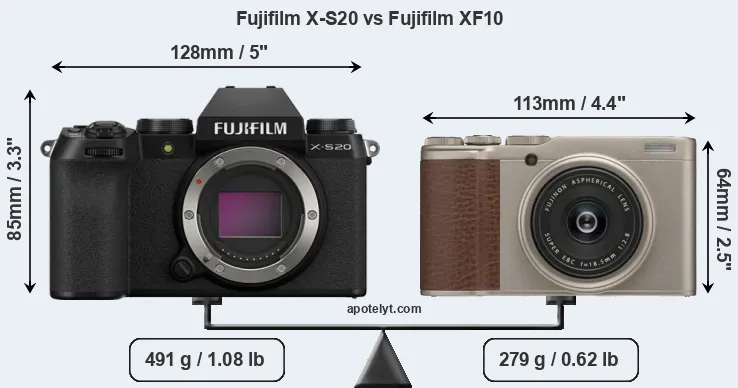 An illustration of the physical size and weight of the Fujifilm X-S20 and the Fujifilm XF10 is provided in the side-by-side display below. The two cameras are presented according to their relative size. Three consecutive perspectives from the front, the top, and the back are available. All width, height and depth dimensions are rounded to the nearest millimeter.