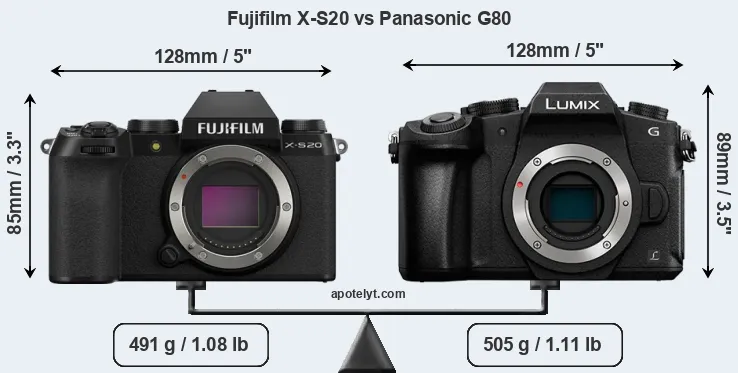 If the front view area (width x height) of the cameras is taken as an aggregate measure of their size, the Panasonic G80 is somewhat larger (5 percent) than the Fujifilm X-S20. Moreover, the G80 is slightly heavier (3 percent) than the X-S20. It is noteworthy in this context that the G80 is splash and dust-proof, while the X-S20 does not feature any corresponding weather-sealing.