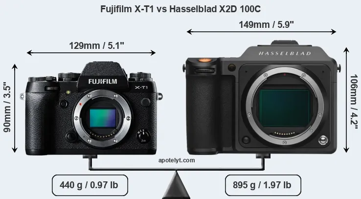 The physical size and weight of the Fujifilm X-T1 and the Hasselblad X2D 100C are illustrated in the side-by-side display below. The two cameras are presented according to their relative size. Three consecutive views from the front, the top, and the rear side are shown. All width, height and depth measures are rounded to the nearest millimeter.