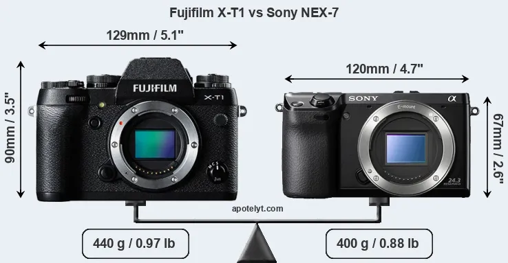 An illustration of the physical size and weight of the Fujifilm X-T1 and the Sony NEX-7 is provided in the side-by-side display below. The two cameras are presented according to their relative size. Three consecutive views from the front, the top, and the rear side are shown. All width, height and depth dimensions are rounded to the nearest millimeter.