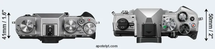 An illustration of the physical size and weight of the Fujifilm X-T10 and the OM System OM-5 is provided in the side-by-side display below. The two cameras are presented according to their relative size. Three consecutive perspectives from the front, the top, and the back are available. All size dimensions are rounded to the nearest millimeter.