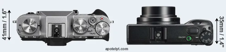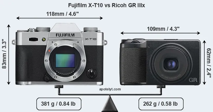 The side-by-side display below illustrates the physical size and weight of the Fujifilm X-T10 and the Ricoh GR IIIx. The two cameras are presented according to their relative size. Three consecutive perspectives from the front, the top, and the back are available. All width, height and depth measures are rounded to the nearest millimeter.