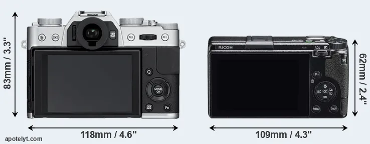 If the front view area (width x height) of the cameras is taken as an aggregate measure of their size, the Ricoh GR IIIx is considerably smaller (31 percent) than the Fujifilm X-T10. In this context, it is worth noting that neither the X-T10 nor the GR IIIx are weather-sealed.