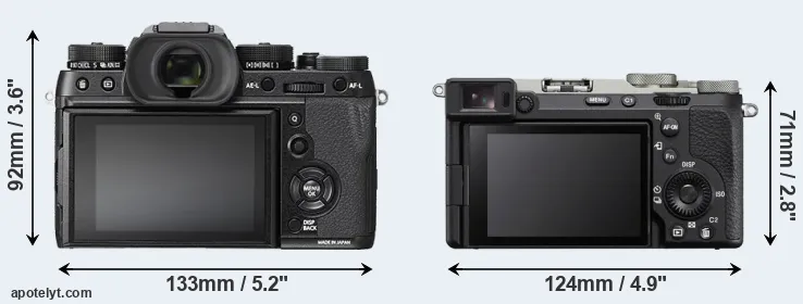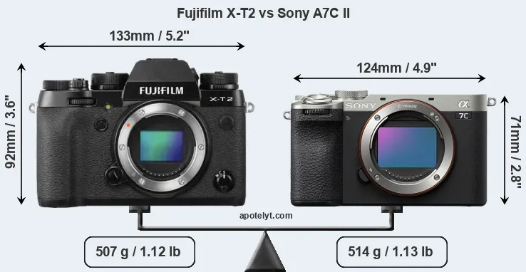 An illustration of the physical size and weight of the Fujifilm X-T2 and the Sony A7C II is provided in the side-by-side display below. The two cameras are presented according to their relative size. Three consecutive views from the front, the top, and the rear side are shown. All width, height and depth measures are rounded to the nearest millimeter.