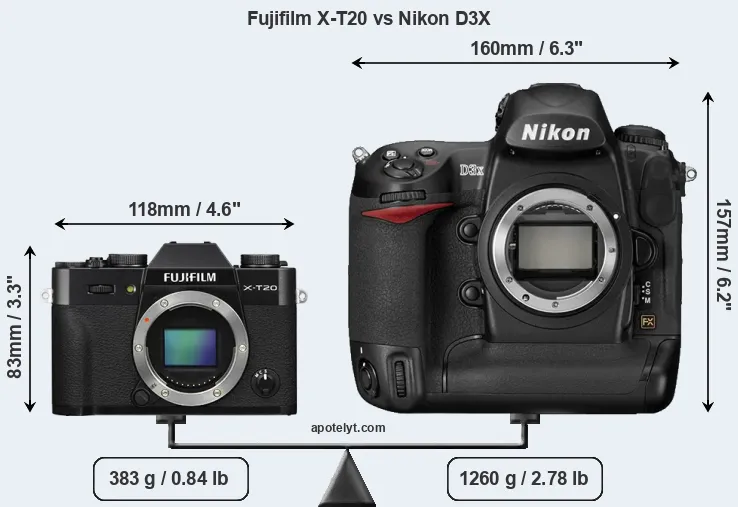 If the front view area (width x height) of the cameras is taken as an aggregate measure of their size, the Nikon D3X is considerably larger (156 percent) than the Fujifilm X-T20. Moreover, the D3X is substantially heavier (229 percent) than the X-T20. It is noteworthy in this context that the D3X is splash and dust-proof, while the X-T20 does not feature any corresponding weather-sealing.
