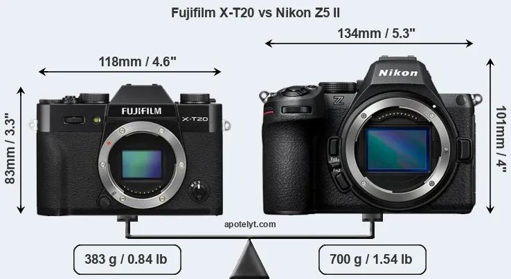 If the front view area (width x height) of the cameras is taken as an aggregate measure of their size, the Nikon Z5 II is notably larger (38 percent) than the Fujifilm X-T20. Moreover, the Z5 II is substantially heavier (83 percent) than the X-T20. It is noteworthy in this context that the Z5 II is splash and dust-proof, while the X-T20 does not feature any corresponding weather-sealing.