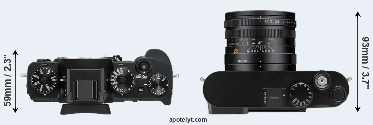 The physical size and weight of the Fujifilm X-T3 and the Leica Q3 are illustrated in the side-by-side display below. The two cameras are presented according to their relative size. Three consecutive views from the front, the top, and the rear side are shown. All size dimensions are rounded to the nearest millimeter.