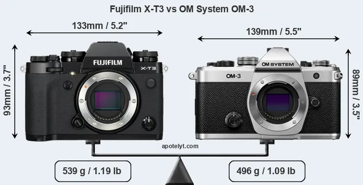 An illustration of the physical size and weight of the Fujifilm X-T3 and the OM System OM-3 is provided in the side-by-side display below. The two cameras are presented according to their relative size. Three consecutive views from the front, the top, and the rear side are shown. All width, height and depth measures are rounded to the nearest millimeter.