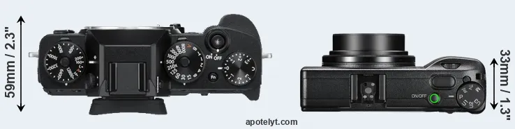 The side-by-side display below illustrates the physical size and weight of the Fujifilm X-T3 and the Ricoh GR III. The two cameras are presented according to their relative size. Three successive views from the front, the top, and the rear are shown. All size dimensions are rounded to the nearest millimeter.