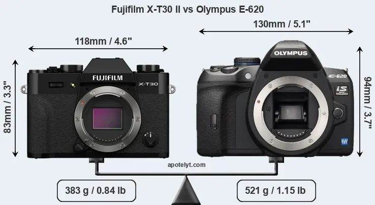 An illustration of the physical size and weight of the Fujifilm X-T30 II and the Olympus E-620 is provided in the side-by-side display below. The two cameras are presented according to their relative size. Three consecutive perspectives from the front, the top, and the back are available. All size dimensions are rounded to the nearest millimeter.