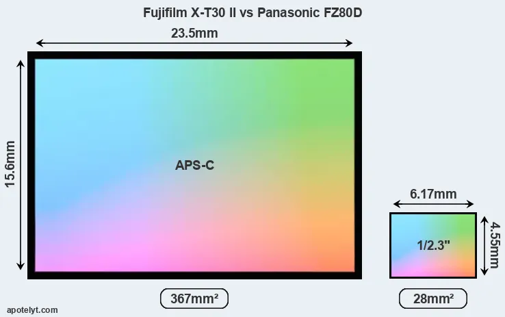 Of the two cameras under consideration, the Fujifilm X-T30 II features an APS-C sensor and the Panasonic FZ80D a 1/2.3-inch sensor. The sensor area in the FZ80D is 92 percent smaller. As a result of these sensor size differences, the cameras have a format factor of, respectively, 1.5 and 5.6. The sensor in the X-T30 II has a native 3:2 aspect ratio, while the one in the FZ80D offers a 4:3 aspect.