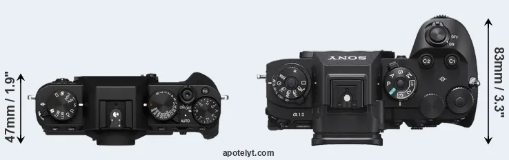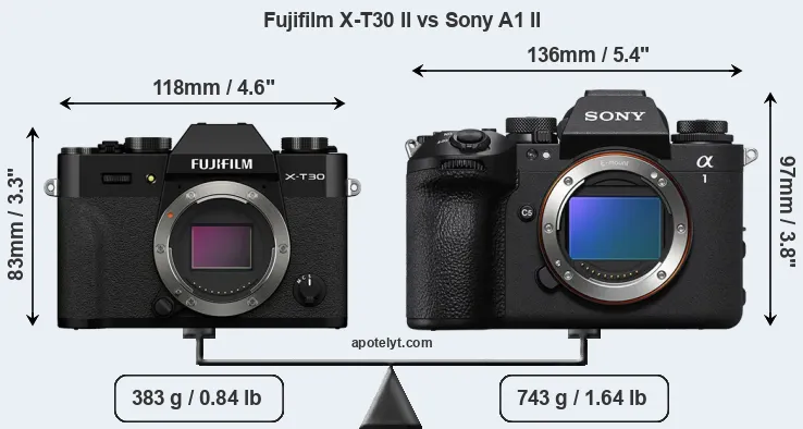 The physical size and weight of the Fujifilm X-T30 II and the Sony A1 II are illustrated in the side-by-side display below. The two cameras are presented according to their relative size. Three consecutive perspectives from the front, the top, and the back are available. All width, height and depth dimensions are rounded to the nearest millimeter.