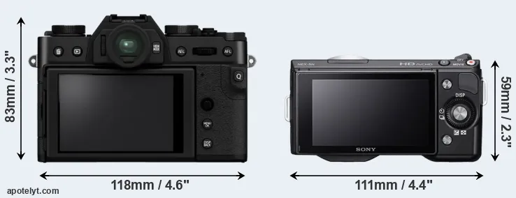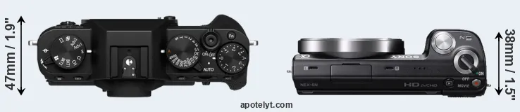 The side-by-side display below illustrates the physical size and weight of the Fujifilm X-T30 II and the Sony NEX-5N. The two cameras are presented according to their relative size. Three consecutive perspectives from the front, the top, and the back are available. All width, height and depth measures are rounded to the nearest millimeter.