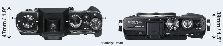 The physical size and weight of the Fujifilm X-T30 and the Olympus E-PL7 are illustrated in the side-by-side display below. The two cameras are presented according to their relative size. Three consecutive perspectives from the front, the top, and the back are available. All width, height and depth dimensions are rounded to the nearest millimeter.