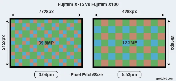 Despite having a slightly smaller sensor, the Fujifilm X-T5 offers a higher resolution of 39.8 megapixels, compared with 12.2 MP of the Fujifilm X100. This megapixels advantage comes at the cost of a higher pixel density and a smaller size of the individual pixel (with a pixel pitch of 3.04μm versus 5.53μm for the X100). However, it should be noted that the X-T5 is much more recent (by 12 years and 1 month) than the X100, and its sensor will have benefitted from technological advances during this time that make it possible to gather light more efficiently. Coming back to sensor resolution, it should be mentioned that the X-T5 has no anti-alias filter installed, so that it can capture all the detail its sensor resolves.