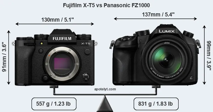 The physical size and weight of the Fujifilm X-T5 and the Panasonic FZ1000 are illustrated in the side-by-side display below. The two cameras are presented according to their relative size. Three successive views from the front, the top, and the rear are shown. All size dimensions are rounded to the nearest millimeter.