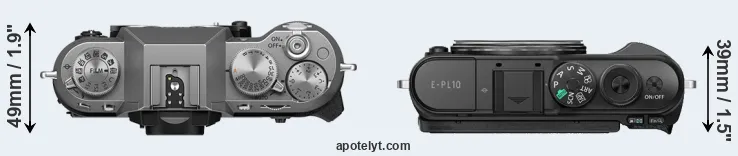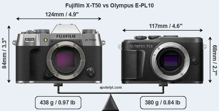 The side-by-side display below illustrates the physical size and weight of the Fujifilm X-T50 and the Olympus E-PL10. The two cameras are presented according to their relative size. Three consecutive views from the front, the top, and the rear side are shown. All size dimensions are rounded to the nearest millimeter.