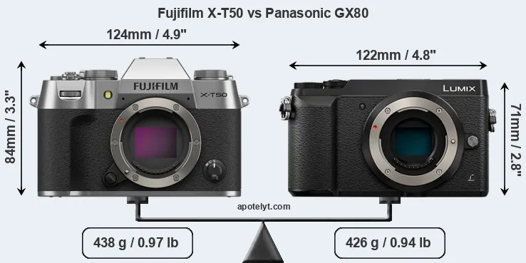 The side-by-side display below illustrates the physical size and weight of the Fujifilm X-T50 and the Panasonic GX80. The two cameras are presented according to their relative size. Three consecutive perspectives from the front, the top, and the back are available. All width, height and depth dimensions are rounded to the nearest millimeter.