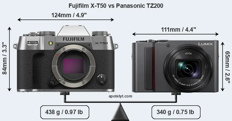 The above size and weight comparisons are to some extent incomplete and possibly misleading, as the TZ200 has a lens built in, whereas the X-T50 is an interchangeable lens camera that requires a separate lens. Attaching the latter will add extra weight and bulk to the setup. You can compare the optics available for the X-T50 and their specifications in the Fujinon X Lens Catalog.