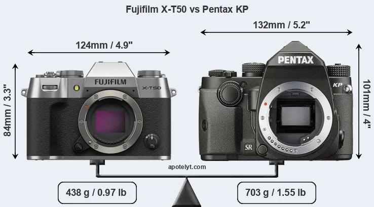 If the front view area (width x height) of the cameras is taken as an aggregate measure of their size, the Pentax KP is notably larger (28 percent) than the Fujifilm X-T50. Moreover, the KP is substantially heavier (61 percent) than the X-T50. It is noteworthy in this context that the KP is splash and dust-proof, while the X-T50 does not feature any corresponding weather-sealing.