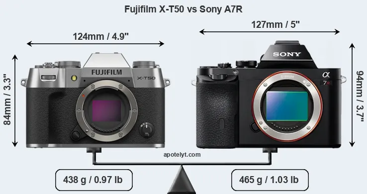 If the front view area (width x height) of the cameras is taken as an aggregate measure of their size, the Sony A7R is notably larger (15 percent) than the Fujifilm X-T50. Moreover, the A7R is markedly heavier (6 percent) than the X-T50. It is noteworthy in this context that the A7R is splash and dust-proof, while the X-T50 does not feature any corresponding weather-sealing.