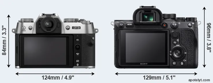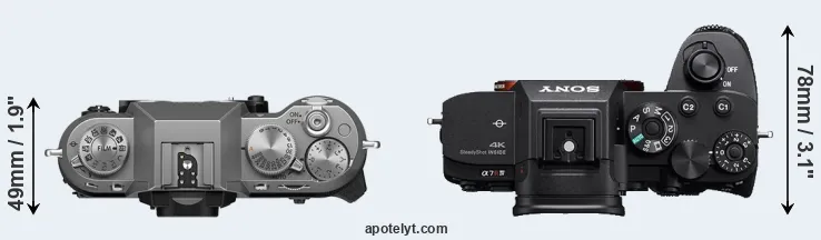 The physical size and weight of the Fujifilm X-T50 and the Sony A7R IV are illustrated in the side-by-side display below. The two cameras are presented according to their relative size. Three successive views from the front, the top, and the rear are shown. All size dimensions are rounded to the nearest millimeter.