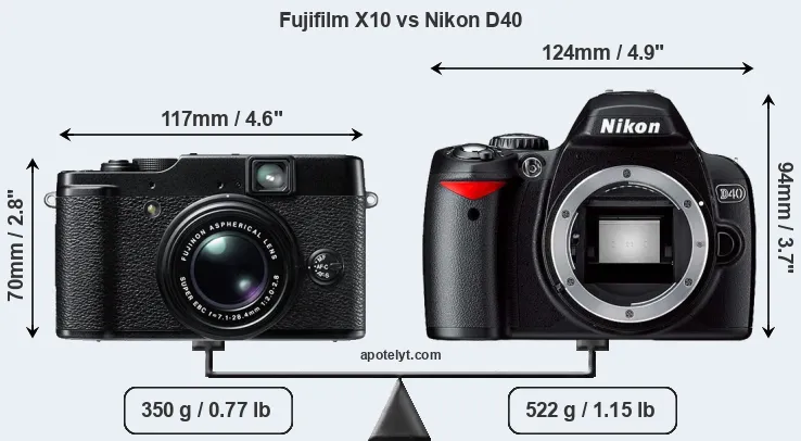 The side-by-side display below illustrates the physical size and weight of the Fujifilm X10 and the Nikon D40. The two cameras are presented according to their relative size. Three consecutive perspectives from the front, the top, and the back are available. All size dimensions are rounded to the nearest millimeter.