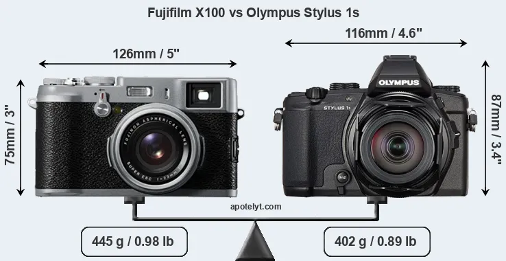 The side-by-side display below illustrates the physical size and weight of the Fujifilm X100 and the Olympus Stylus 1s. The two cameras are presented according to their relative size. Three consecutive perspectives from the front, the top, and the back are available. All width, height and depth measures are rounded to the nearest millimeter.