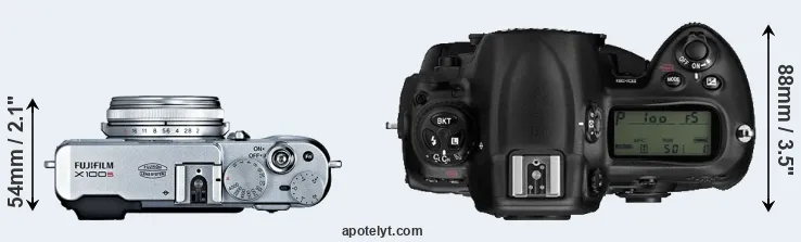 If the front view area (width x height) of the cameras is taken as an aggregate measure of their size, the Nikon D3 is considerably larger (167 percent) than the Fujifilm X100S. It is noteworthy in this context that the D3 is splash and dust-proof, while the X100S does not feature any corresponding weather-sealing.
