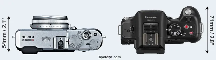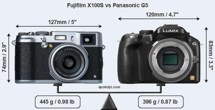 The above size and weight comparisons are to some extent incomplete and possibly misleading, as the X100S has a lens built in, whereas the G5 is an interchangeable lens camera that requires a separate lens. Attaching the latter will add extra weight and bulk to the setup. You can compare the optics available for the G5 and their specifications in the Micro Four Thirds Lens Catalog.