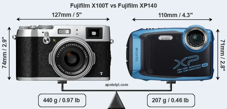 The side-by-side display below illustrates the physical size and weight of the Fujifilm X100T and the Fujifilm XP140. The two cameras are presented according to their relative size. Three consecutive perspectives from the front, the top, and the back are available. All width, height and depth dimensions are rounded to the nearest millimeter.