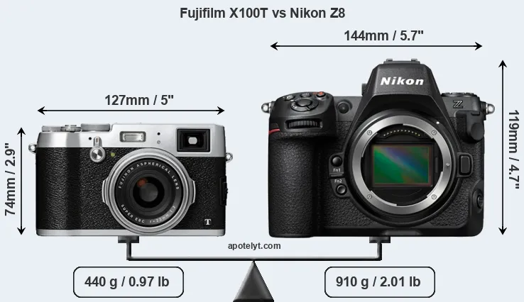 If the front view area (width x height) of the cameras is taken as an aggregate measure of their size, the Nikon Z8 is considerably larger (82 percent) than the Fujifilm X100T. It is noteworthy in this context that the Z8 is splash and dust-proof, while the X100T does not feature any corresponding weather-sealing.