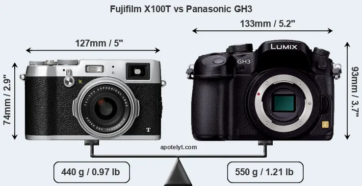 The above size and weight comparisons are to some extent incomplete and possibly misleading, as the X100T has a lens built in, whereas the GH3 is an interchangeable lens camera that requires a separate lens. Attaching the latter will add extra weight and bulk to the setup. You can compare the optics available for the GH3 and their specifications in the Micro Four Thirds Lens Catalog.
