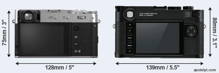 The physical size and weight of the Fujifilm X100VI and the Leica M10 are illustrated in the side-by-side display below. The two cameras are presented according to their relative size. Three successive views from the front, the top, and the rear are shown. All width, height and depth measures are rounded to the nearest millimeter.