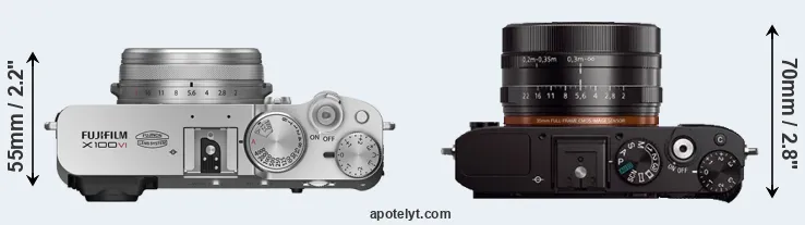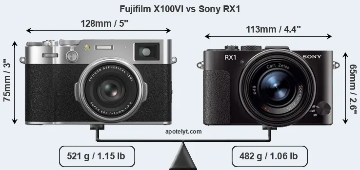 The side-by-side display below illustrates the physical size and weight of the Fujifilm X100VI and the Sony RX1. The two cameras are presented according to their relative size. Three consecutive perspectives from the front, the top, and the back are available. All width, height and depth dimensions are rounded to the nearest millimeter.