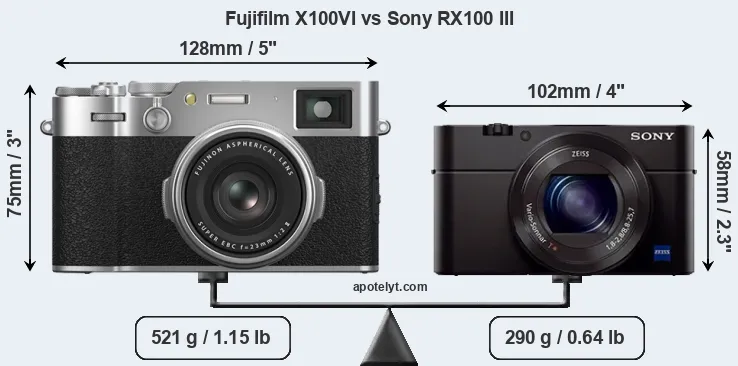If the front view area (width x height) of the cameras is taken as an aggregate measure of their size, the Sony RX100 III is considerably smaller (38 percent) than the Fujifilm X100VI. Moreover, the RX100 III is substantially lighter (44 percent) than the X100VI. It is worth mentioning in this context that the X100VI is splash and dust resistant, while the RX100 III does not feature any corresponding weather-sealing.
