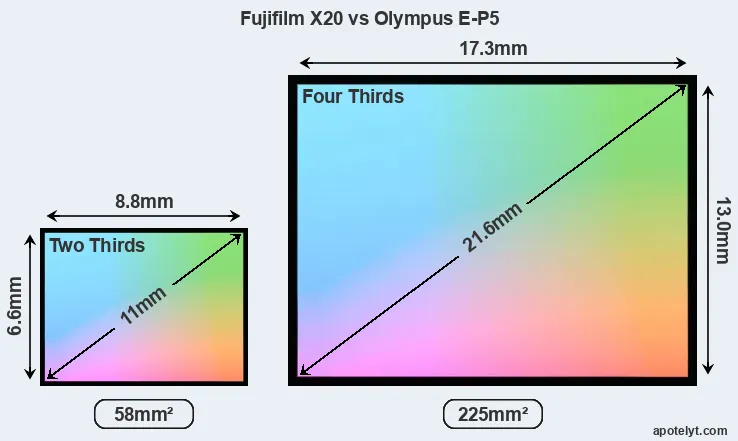 Of the two cameras under consideration, the Fujifilm X20 features a 2/3 sensor and the Olympus E-P5 a Four Thirds sensor. The sensor area in the E-P5 is 288 percent bigger. As a result of these sensor size differences, the cameras have a format factor of, respectively, 3.9 and 2.0. Both cameras feature a native aspect ratio (sensor width to sensor height) of 4:3.
