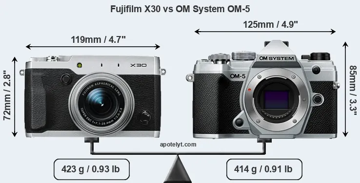 If the front view area (width x height) of the cameras is taken as an aggregate measure of their size, the OM System OM-5 is notably larger (24 percent) than the Fujifilm X30. It is noteworthy in this context that the OM-5 is splash and dust-proof, while the X30 does not feature any corresponding weather-sealing.