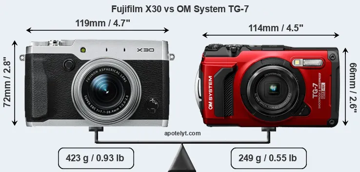 The physical size and weight of the Fujifilm X30 and the OM System TG-7 are illustrated in the side-by-side display below. The two cameras are presented according to their relative size. Three consecutive perspectives from the front, the top, and the back are available. All width, height and depth measures are rounded to the nearest millimeter.