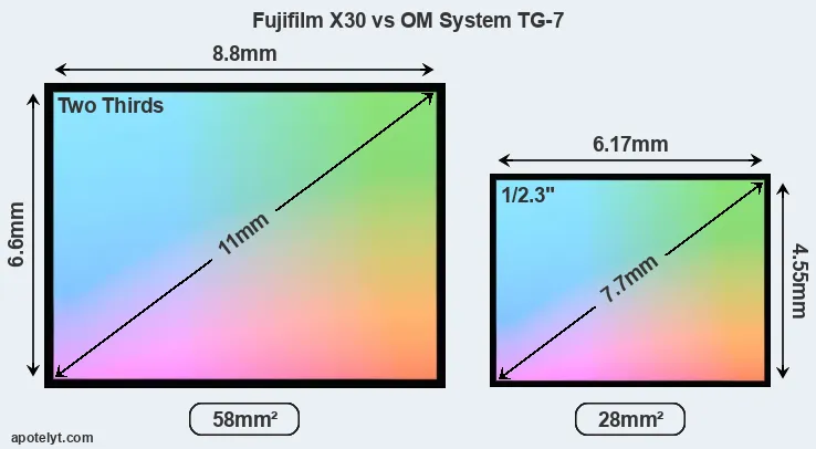 Of the two cameras under consideration, the Fujifilm X30 features a 2/3 sensor and the OM System TG-7 a 1/2.3-inch sensor. The sensor area in the TG-7 is 52 percent smaller. As a result of these sensor size differences, the cameras have a format factor of, respectively, 3.9 and 5.6. Both cameras feature a native aspect ratio (sensor width to sensor height) of 4:3.
