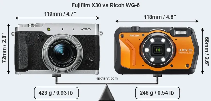 The side-by-side display below illustrates the physical size and weight of the Fujifilm X30 and the Ricoh WG-6. The two cameras are presented according to their relative size. Three consecutive views from the front, the top, and the rear side are shown. All width, height and depth measures are rounded to the nearest millimeter.