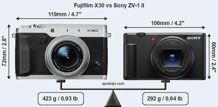 If the front view area (width x height) of the cameras is taken as an aggregate measure of their size, the Sony ZV-1 II is notably smaller (26 percent) than the Fujifilm X30. Moreover, the ZV-1 II is markedly lighter (31 percent) than the X30. In this context, it is worth noting that neither the X30 nor the ZV-1 II are weather-sealed.