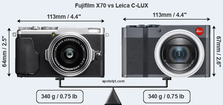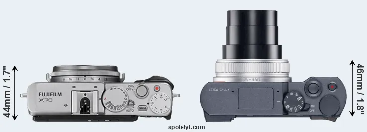 The side-by-side display below illustrates the physical size and weight of the Fujifilm X70 and the Leica C-LUX. The two cameras are presented according to their relative size. Three successive views from the front, the top, and the rear are shown. All width, height and depth measures are rounded to the nearest millimeter.